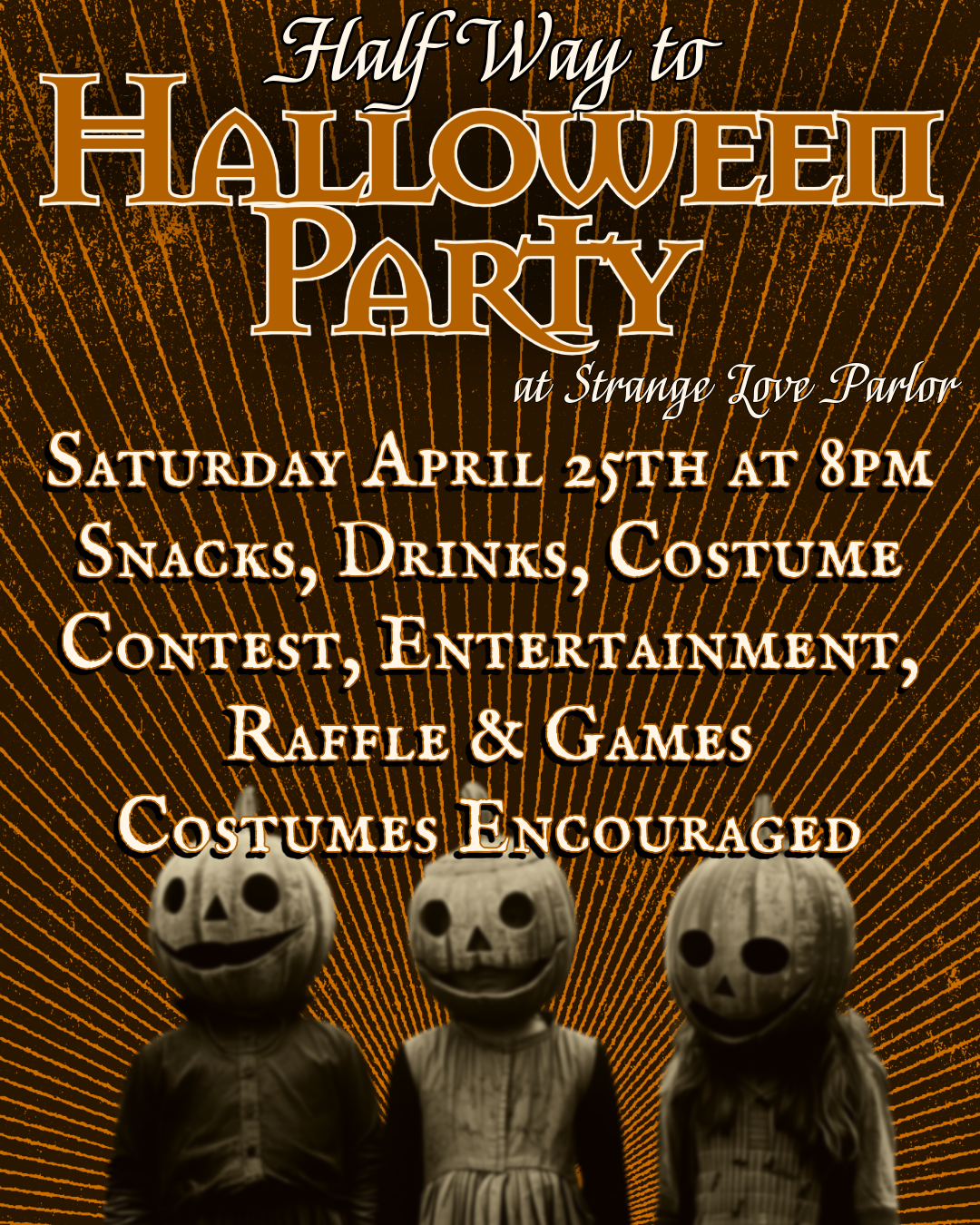 Themed snacks, drinks, raffles, entertainment, and more on Saturday April 25th at 8pm. Let’s party like it’s Halloween!